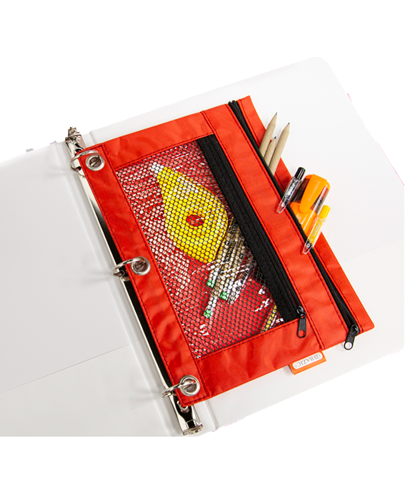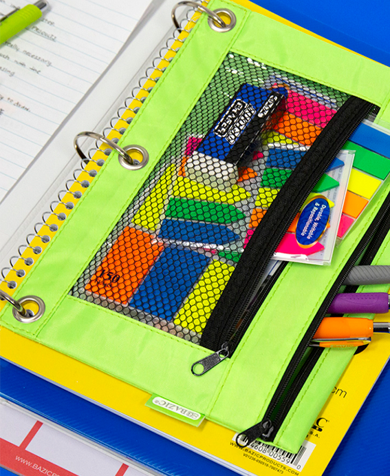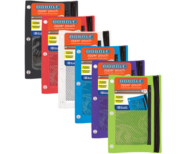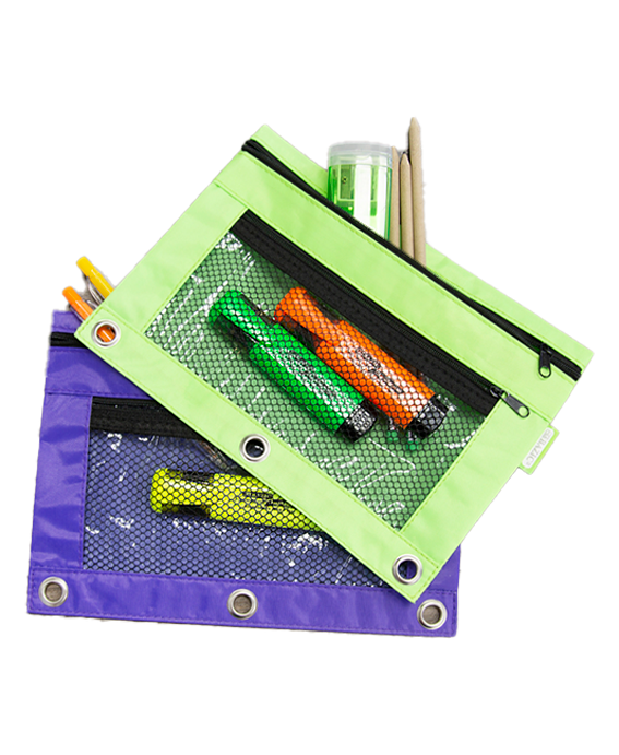 Estuche para lápices con cremallera doble de 3 aros y ventana de mallacon tamaño: 9.5″ x 7″. Hecho de poliéster 420D duradero, resistente a rayones. 6 colores: Negro, Blanco, Verde, Rojo, Azul, Púrpura. Característica que refuerza el orificio de 3 anillos en las bolsas para unirlas a las carpetas.Seguro y no tóxico. Cuenta con un cierre de cremallera de calidad para un fácil acceso y asegura todos tus artículos. Un compartimento. ideal para organizar artículos pequeños como boligrafo