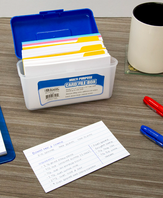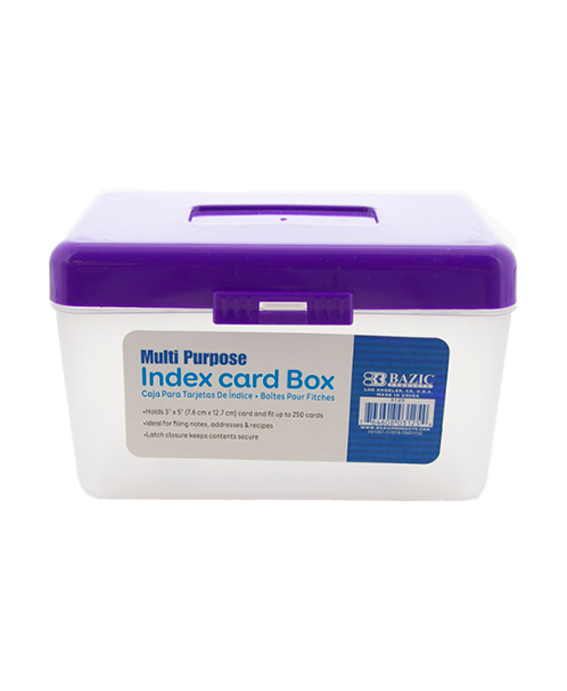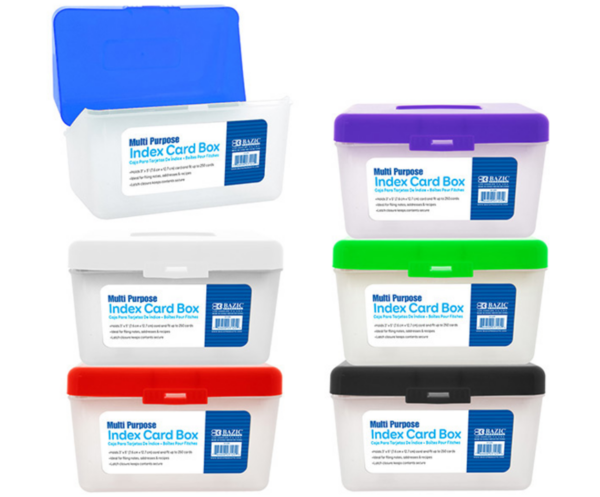 Caja para archivos de tarjetas de 3″ X 5″ con medida: 5,5″ x 3,5″ x 2,9″. Tiene capacidad para tarjetas de tamaño 3″ x 5″ y admite hasta 250 tarjetas. Ideal para almacenar fichas, tarjetas de visita, notas de archivo, tarjetas flash, direcciones, fotos, cupones y recibos.Hecho de cajas de plástico PP no tóxicas y sin BPA. El cierre de pestillo mantiene el contenido seguro.