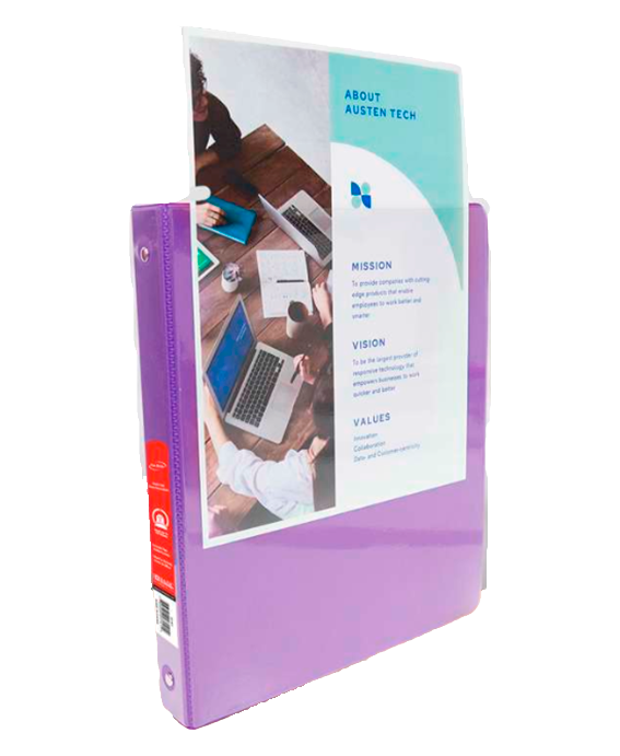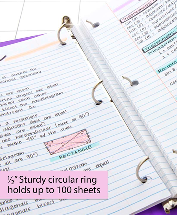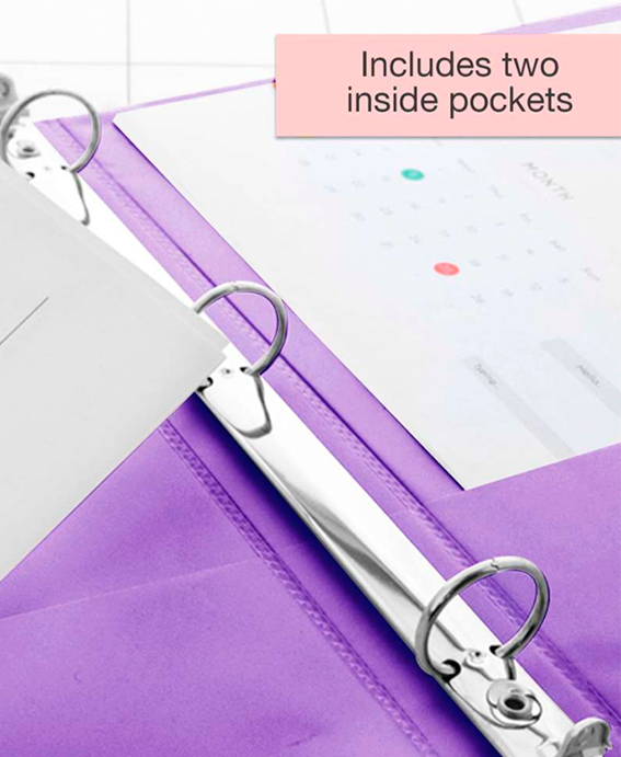 Carpeta de 0.5″ Morada de 3 aros con 2 bolsillos, la carpeta de 1/2″ puede contener hasta 100 hojas/papeles. Los anillos se abren y cierran fácilmente para agregar páginas según sea necesario. Diseñado y fabricado con mayor durabilidad con una cubierta resistente a desgarros con cubiertas transparentes para insertar o personalizar su carpeta en el frente, el reverso y el lomo. Dos bolsillos interiores para almacenamiento adicional.