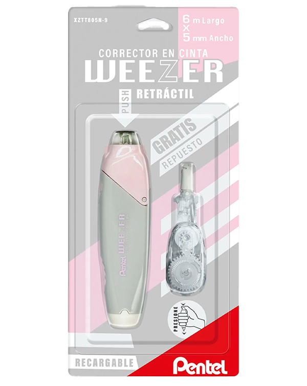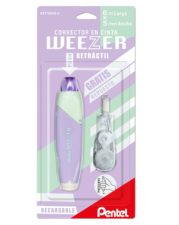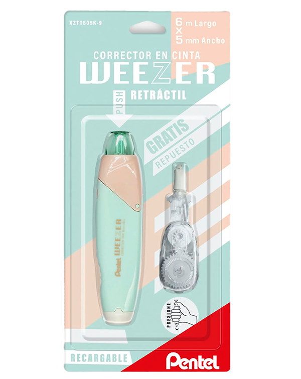 Cinta correctora Weezer maraca Pentel, Es retractil y recargable, 6 m de largo y 5 mm de ancho La cinta se adhiere bien al papel y se corta de manera limpia con un resultado excelente, Puedes encontrarlo en 4 diferentes colores pastel; Azul con amarillo, Gris con rosa, Morado con verde y Verde con durazno (sujeto a existencias)