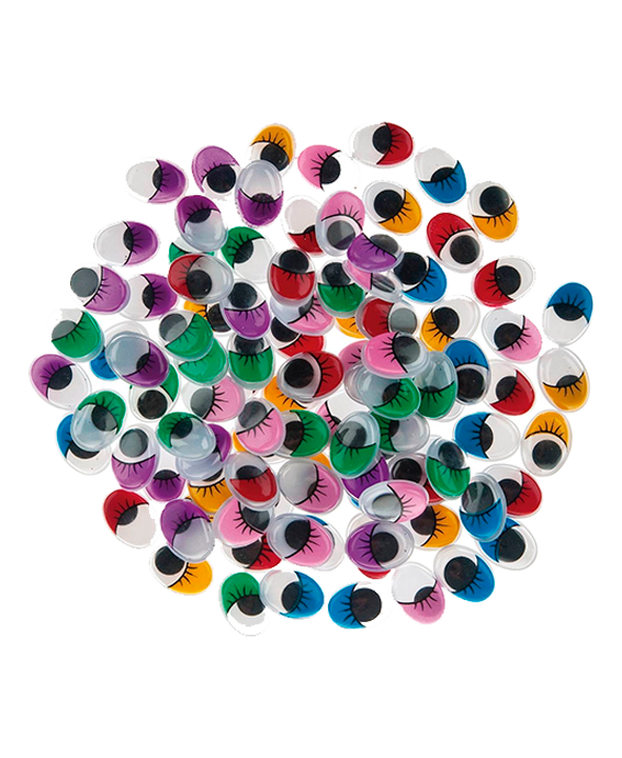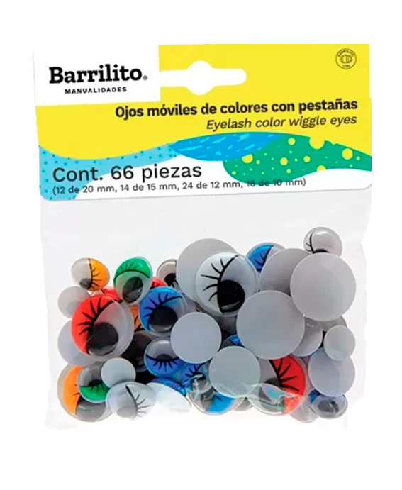 Ojos móviles con pestañas y 4 tamaños diferentes. Contenido de: 66 ojos por bolsa.