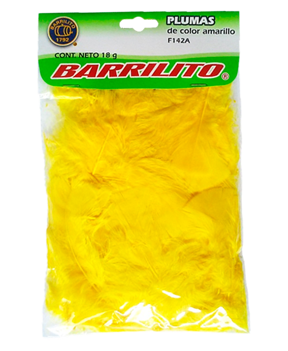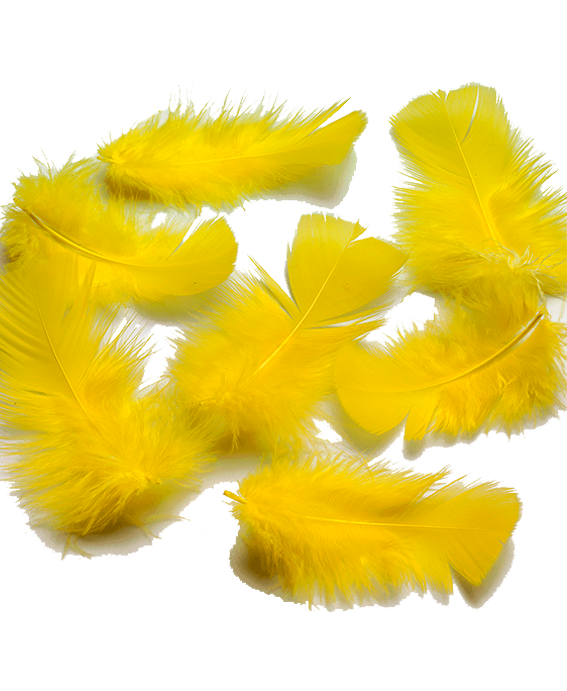 Plumas de ave naturales teñidas en color Amarillo, el paquete contiene 18 gramos de pequeñas plumas, son ideales para cualquier tipo de manualidades y artesanias.