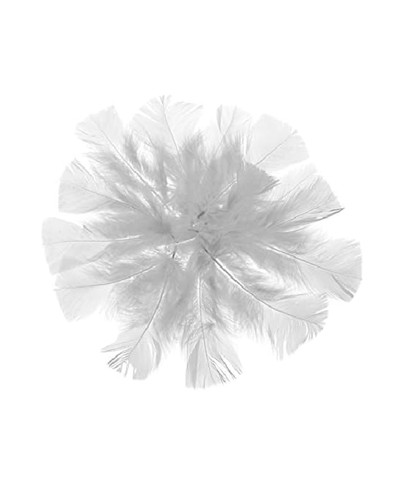 Plumas de ave naturales teñidas en color Blanco, el paquete contiene 18 gramos de pequeñas plumas, son ideales para cualquier tipo de manualidades y artesanias.