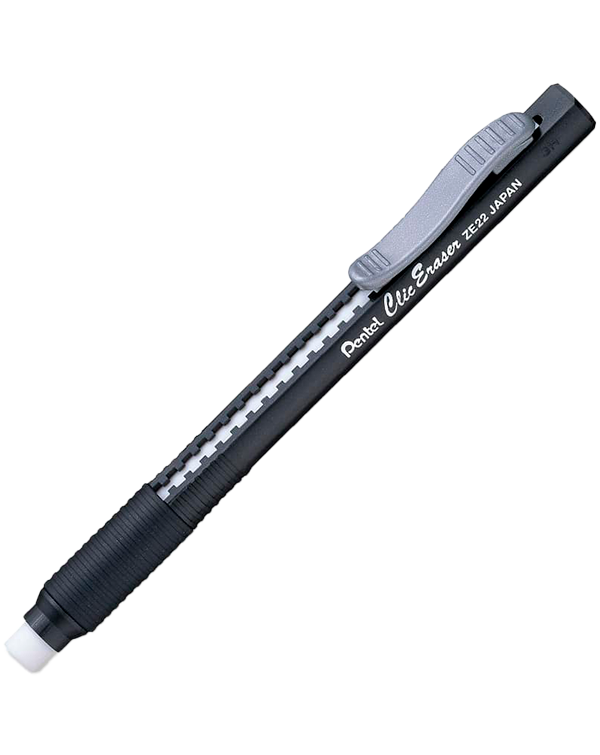 Borrador tipo lapiz recargable “Clic eraser” cuerpo color negro Clip de bolsillo versátil para avanzar y retraer borrador con “clic” Realiza un borrado suave y detallado, que no rompe ni daña el papel. Puede borrar con poca presión.