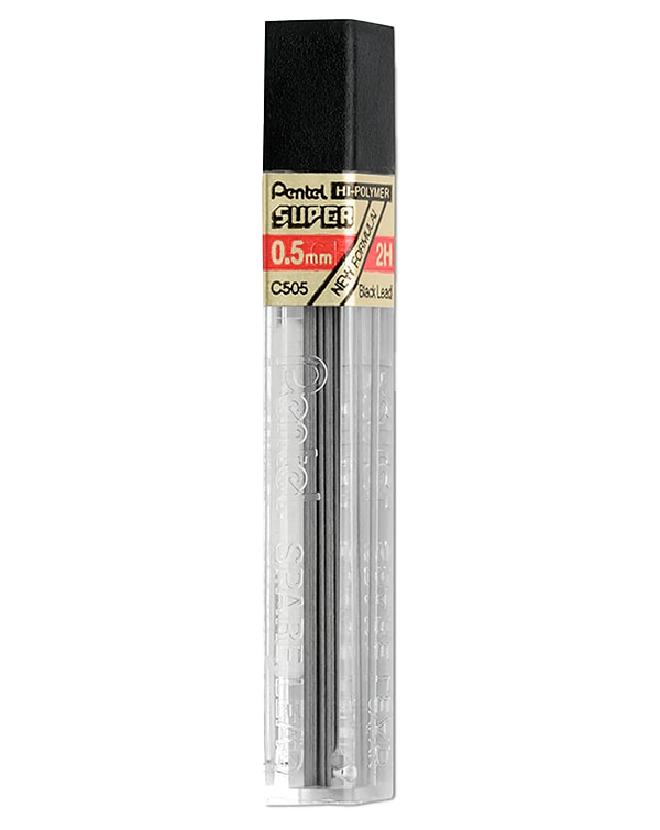 Puntilla Super Hil-Polymer marca Pente Tipo 2H PUNTO 0.5 MM ,contienen mayor de grafito. Utilizando como ligadura entre el carbono y el grafito una estructura esponjosa altamente resistente, creando así, una mina resistente, gruesa y suave.