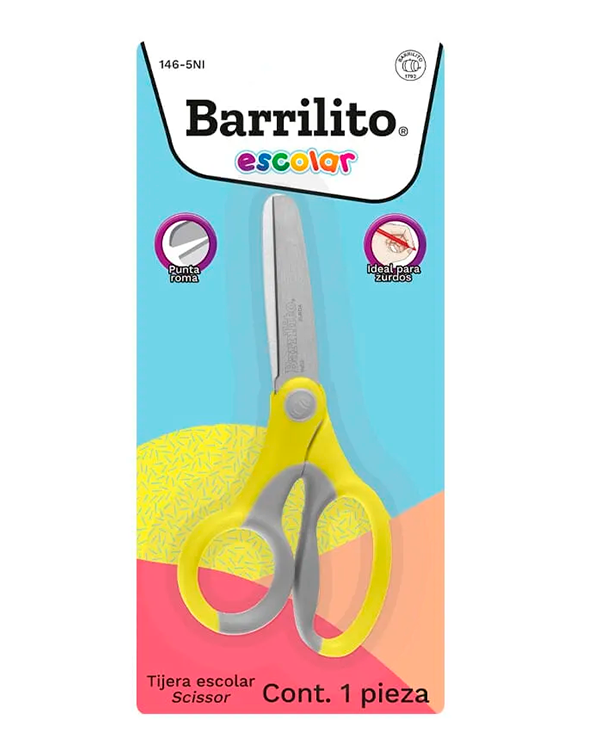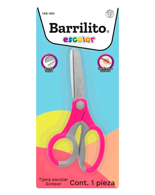 Tijera escolar acero inoxidable ideal para zurdos, punta roma, Soft en mangos. Mangos plásticos ergonómicos, Hojas de acero inoxidable.