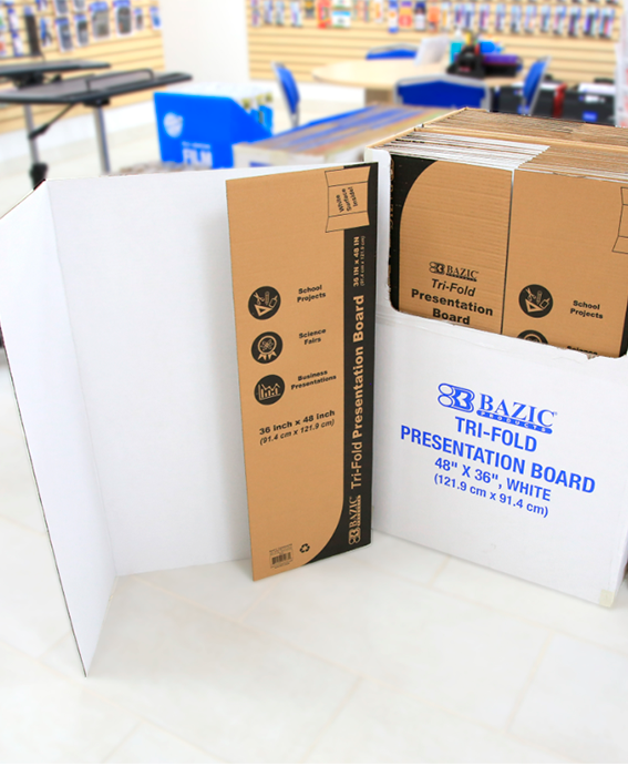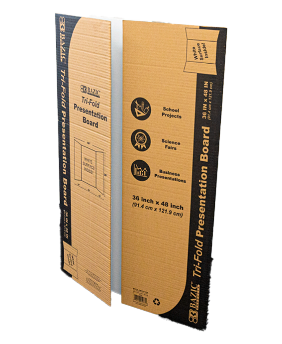 “Tablero de presentación corrugado triple color blanco con tamaño de 36 X 48 pulgadas. Libre de ácido. Espesor: 1/8″”. Pared simple con flauta B.Aspecto duradero, bellamente acabado y profesional, Perfecto para proyectos escolares.”